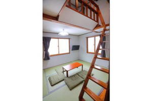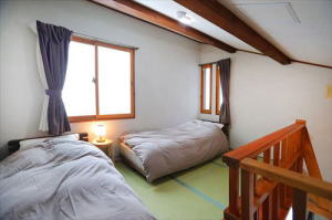 The room is for 1-4 persons, 2 semi-single beds [in the loft] + 3 futons.